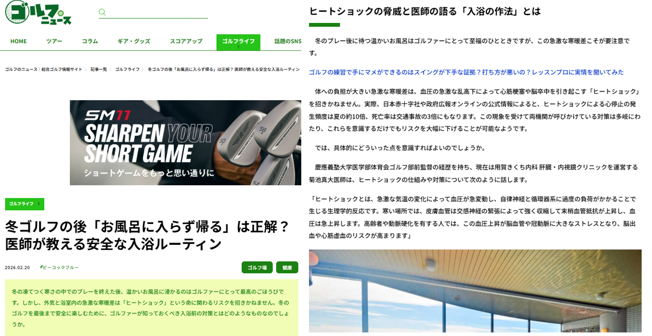 アンダー80を目指す方まで楽しめるゴルフの総合サイト メディア・ヴァーグさんからの依頼で、 ゴルフ場でのヒートショックについて記事を執筆しました。慶應義塾大学医学部体育会ゴルフ部前監督としてコメントしました。Yahoo ニュースにも掲載されます。
