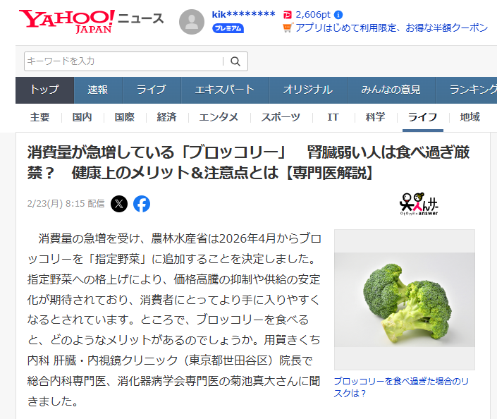 ブロッコリーの健康上のメリット&注意点 Yahooニュース記載