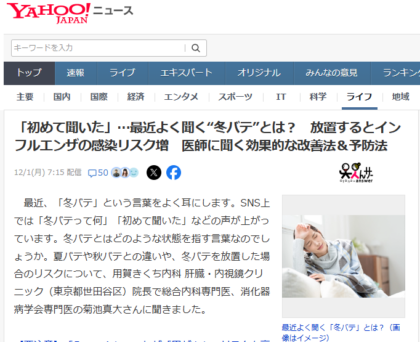 「初めて聞いた」…最近よく聞く“冬バテ”とは? 放置するとインフルエンザの感染リスク増 Yahooニュース記載