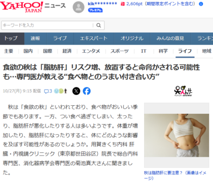 食欲の秋は「脂肪肝」リスク増、放置すると命脅かされる可能性も Yahooニュース記載
