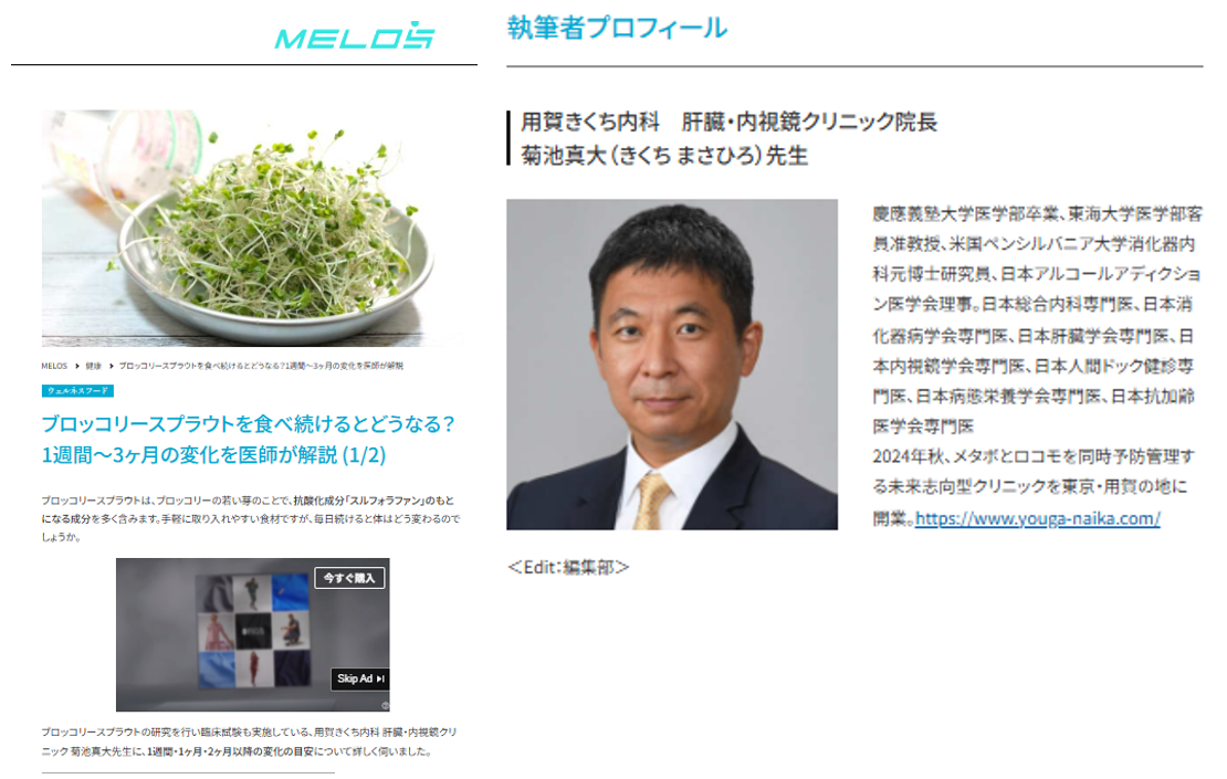 ブロッコリースプラウト摂取後の経時的変化について WEB記載 2026.02.22 メディア掲載 筋肉・フィットネス・ライフスタイルを軸にしたスポーツ系WebメディアのMELOSさんからの依頼で、 院長得意のブロッコリースプラウトついて記事を執筆しました。 ーーーーーー ■URL:ブロッコリースプラウトを食べ続けるとどうなる?1週間〜3ヶ月の変化を医師が解説 | 健康 ×スポーツ『MELOS』 ーーーーーー