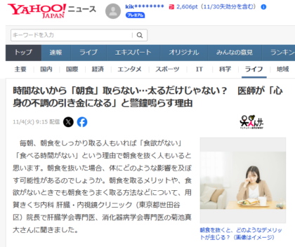 時間ないから「朝食」取らない…太るだけじゃない? Yahooニュース記載 2025.11.05 朝食をとる重要性について、ライフスタイル情報を発信するメディア”オトナンサー”に取り上げていただき、Yahooニュースに記事として執筆しました。是非、ご覧ください。 ーーーーーー ■URL:時間ないから「朝食」取らない…太るだけじゃない? 医師が「心身の不調の引き金になる」と警鐘鳴らす理由(オトナンサー) - Yahoo!ニュース 時間ないから「朝食」取らない…太るだけじゃない? 医師が「心身の不調の引き金になる」と警鐘鳴らす理由 | オトナンサー ーーーーーー