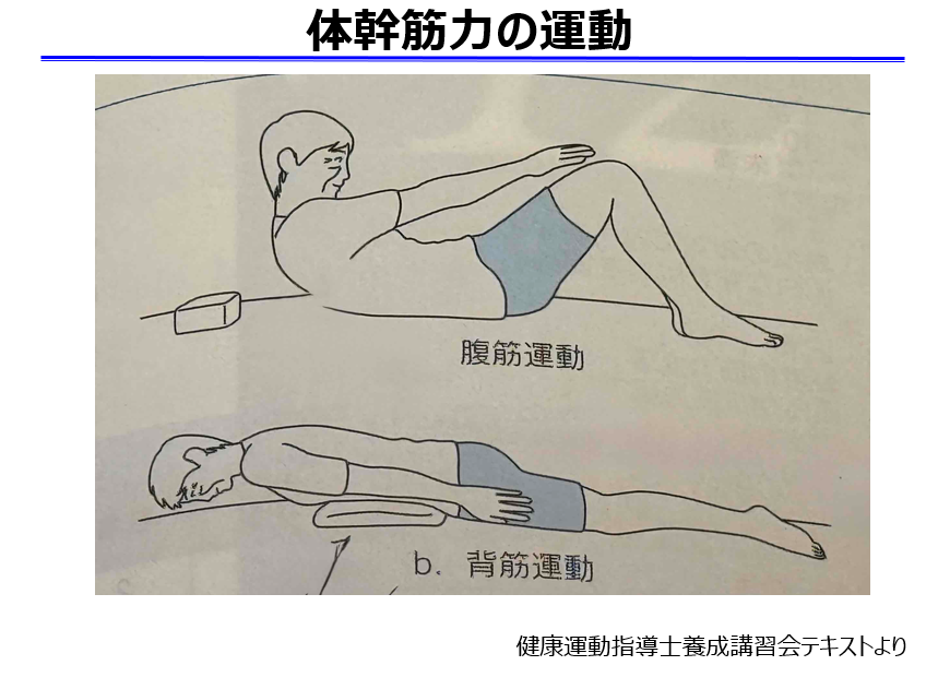 腹筋運動は、完全に体を起こすのではなく、少し起こすことが最も腹部の屈曲筋に効果が出ます。背筋運動を行うときも腹部にタオルを置き、反りすぎないようにします。反りすぎは腰椎の前弯の増強に繋がり危険です。