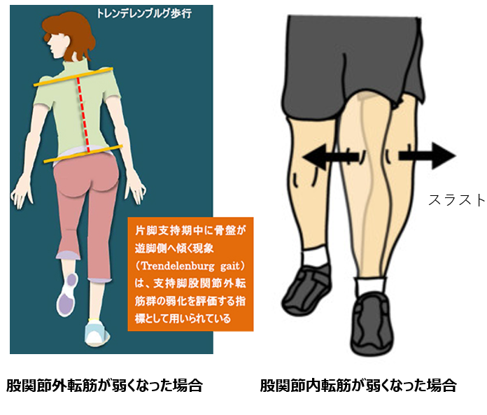 一方で、股関節の内転筋が衰えると、膝蓋骨を正しい位置に引き上げる力が弱まり、膝蓋骨が上内方へずれやすくなります。その結果、膝蓋骨と大腿骨の噛み合わせが悪くなり、両者の間にある軟骨がすり減り、スラスト(膝が外側に押し出されるような動き)が生じてしまいます。