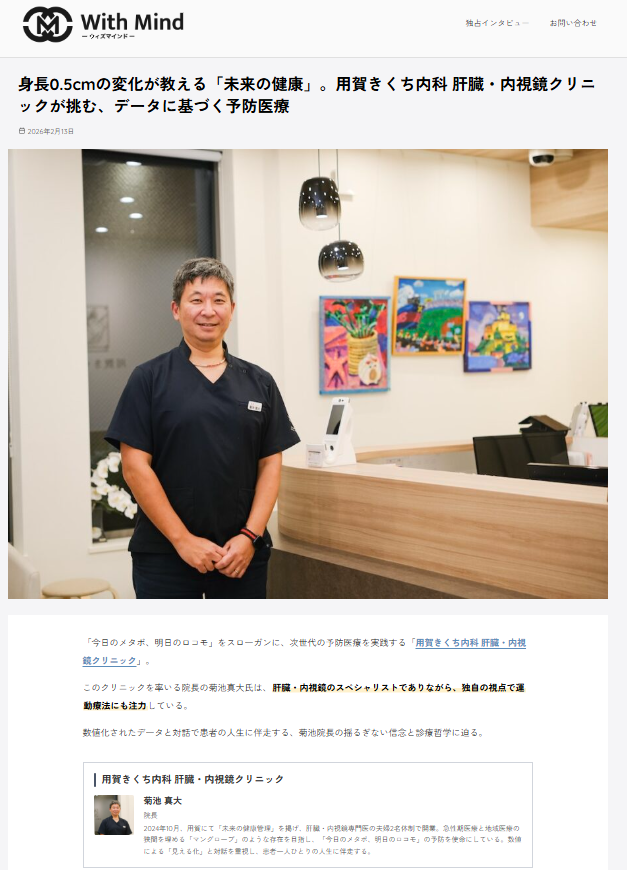 詳しくは「身長0.5cmの変化が教える『未来の健康』。用賀きくち内科 肝臓・内視鏡クリニックが挑む、データに基づく予防医療」(https://with-mind.jp/yoga-kikuchinaika/)をご確認ください。