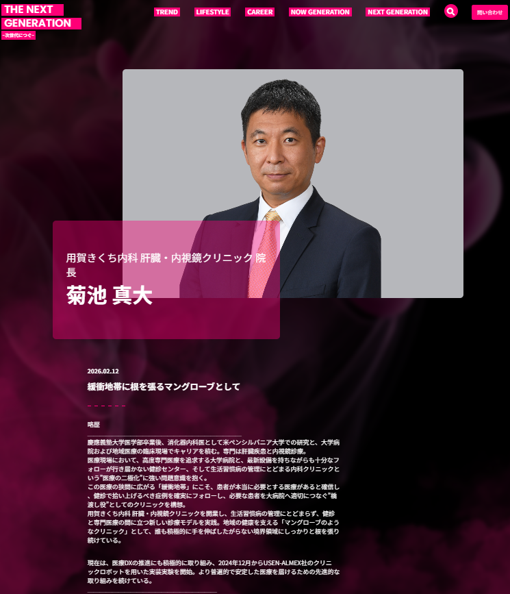 混迷の時代に向けた若者達のバイブルメディア ”NEXT GENERATION”から、これからの時代を担う次世代の若者たちへのメッセージを依頼され、インタビュー記事が掲載されました。 次世代に繋げる医療について、是非ご覧ください。
