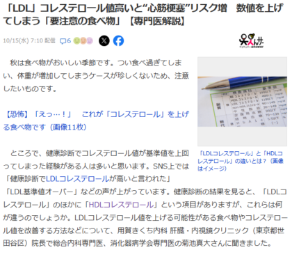 「LDL」コレステロール値高いと“心筋梗塞”リスク増 数値を上げてしまう「要注意の食べ物」 Yahooニュース記載