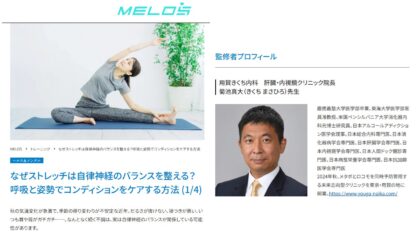 筋肉・フィットネス・ライフスタイルを軸にしたスポーツ系WebメディアのMELOSさんからの依頼で、ストレッチで自律神経を整える方法について、記事監修しました。急激な気象変化にともない自律神経が乱れやすい時期です。是非ご覧ください。
