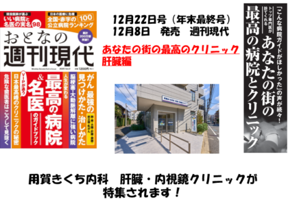 12月8日発売(12月22日号)の週刊現代の中で、あなたの街の最高の病院とクリニック肝臓編の特集が組まれ、用賀きくち内科 肝臓・内視鏡クリニックが登場します。 ”肝臓から始まる健康寿命の延伸” 院長が展開する未来志向型医療について。是非、ご覧ください。